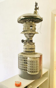 The other ‘distant skyscraper’ model is made from 16 identical plastic containers glued back-to-back (currently broken in two). Forms a building 19½ inches (50 cm) tall.