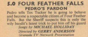 1960 – 5.00pm – Four Feather Falls – Pedro’s Pardon (Granada, Anglia, ATV Midlands, Scottish, Associated-Rediffusion, Southern, Ulster, Tyne Tees and T.W.W.)