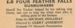 1960 – 5.00pm – Four Feather Falls – Gunrunners (Granada, ATV Midlands, Anglia, Associated-Rediffusion, Southern, Scottish, Ulster, Tyne Tees and T.W.W.)