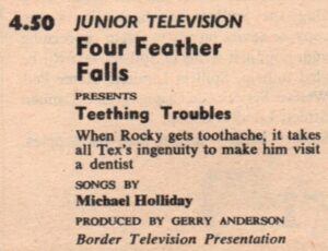 1963 – 4.50pm – Four Feather Falls is shown for the last time on Border Television with the episode Teething Troubles, nine episodes of the series are unscreened in this region
